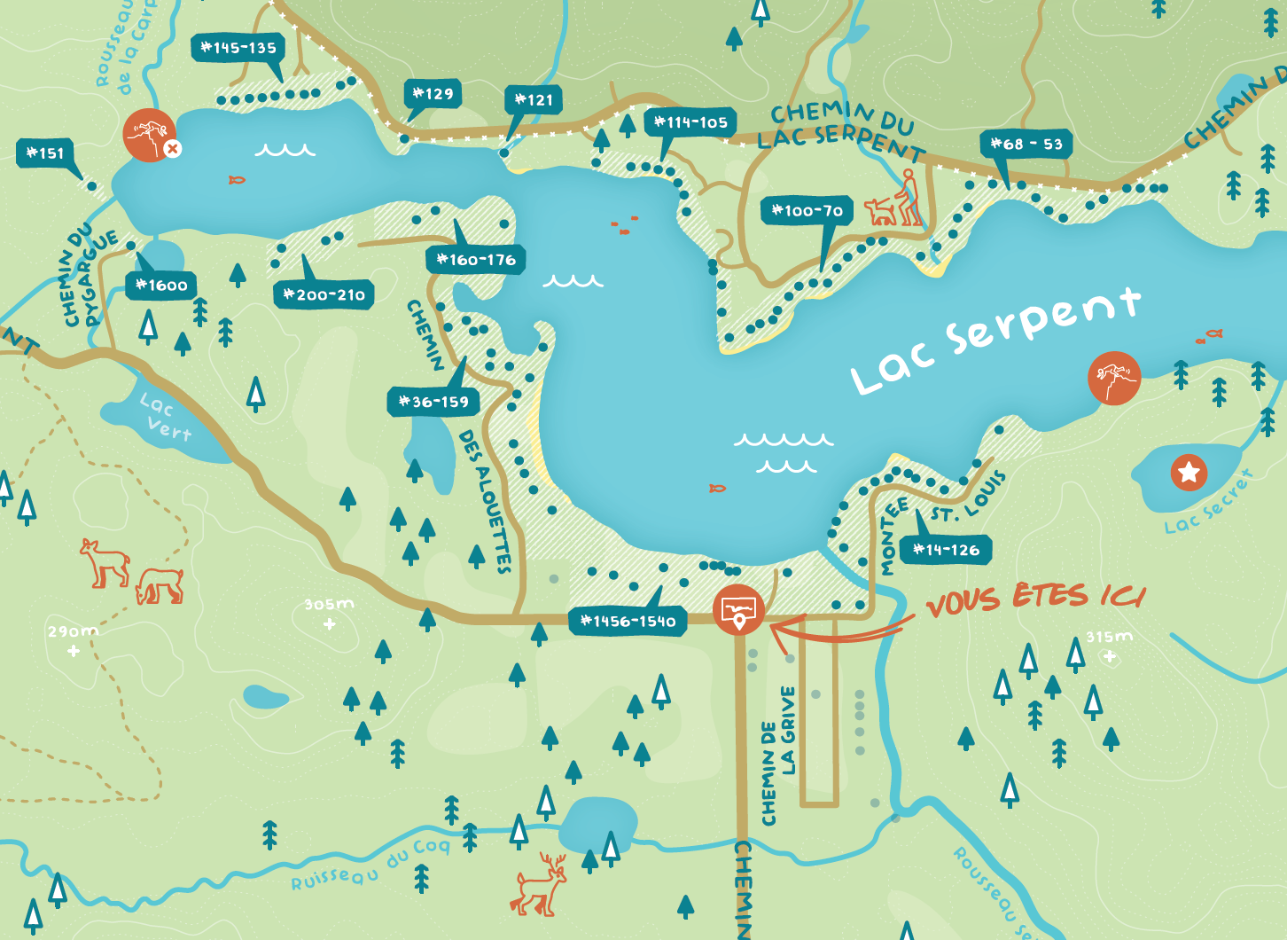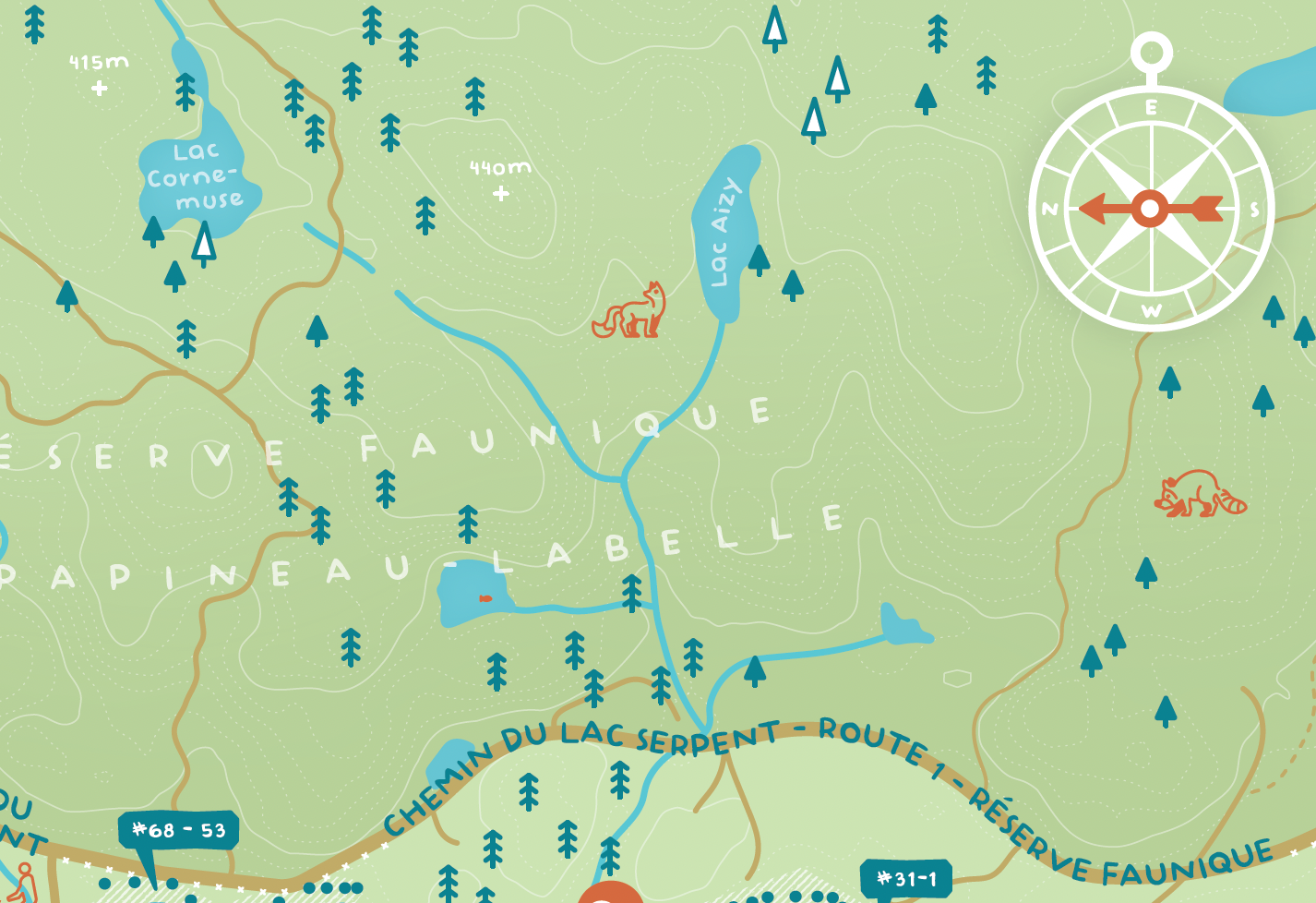 Bonjour en bienvenue au Lac Serpent! De Canadese woonvereniging van bewoners rondom dit langgerekte meer konden het gebieds overzichtsbord uit de jaren ‘70 niet meer aanzien (oke, en het was ook niet meer al te goed leesbaar) en vroegen ons om een vernieuwd bord van 5x3,5 meter te maken van hun prachtige omgeving.